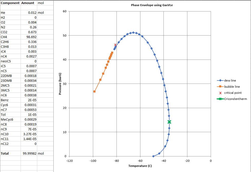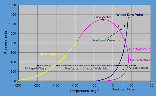 HCDP有时被称为“液体烃”,表示当烃冷凝物开始形成时,天然气从完全气相进入混合相的温度。该参数受压力和成分的影响,因此气体混合物中重烃的比例越高,HCDP就会越高。每种气体成分都有其独特的烃露点温度和压力关系,可以将其描述为相包络上的露点线曲线(见下图)。临界凝析温度是在压力X下气体开始凝析出液体的温度。当天然气处理将临界凝析温度保持在管道最低工作温度以下时,无论压力变化如何,气流都不含有液态烃。